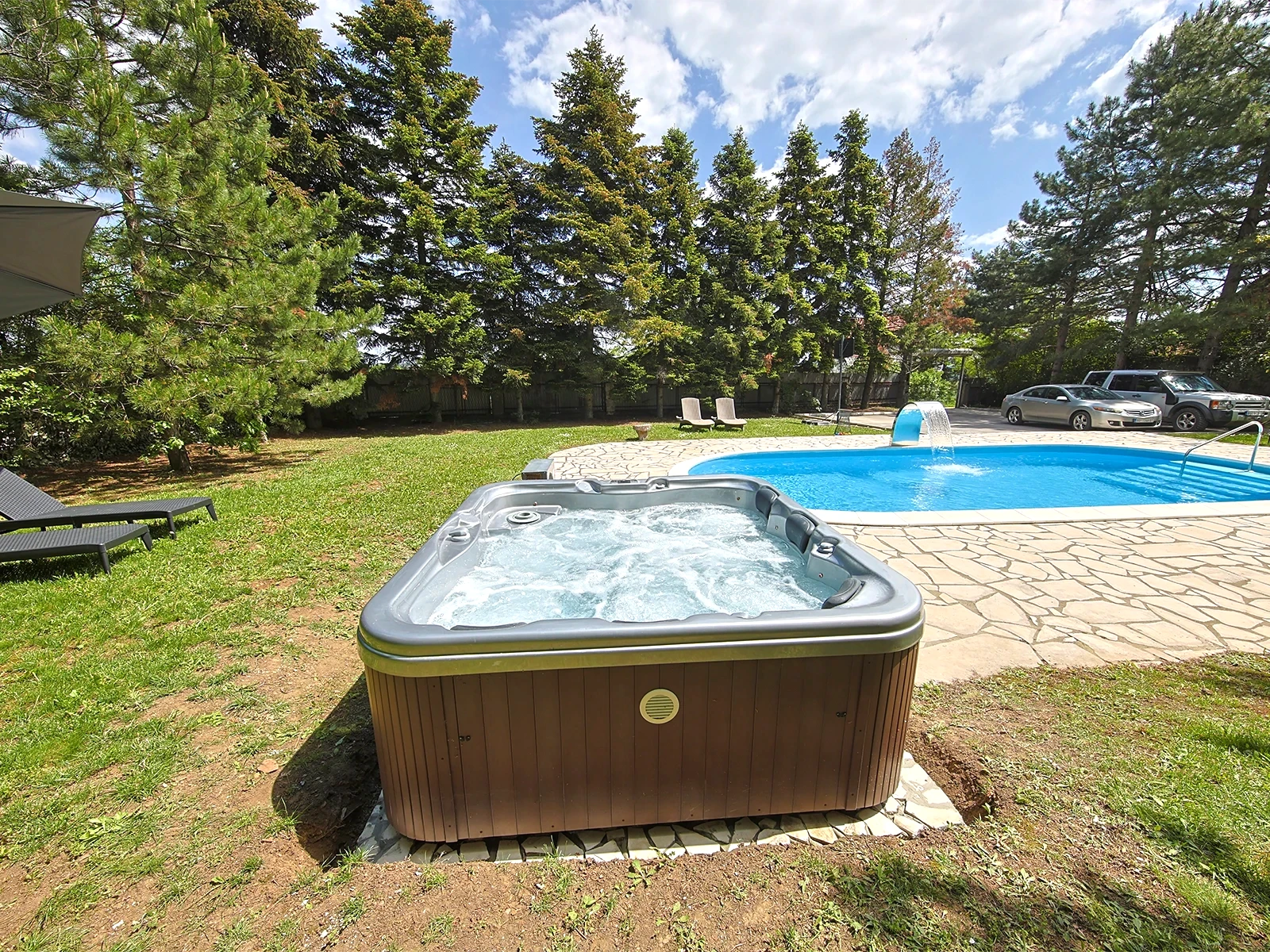 This spacious family retreat is ideal for families and groups seeking comfort, fun, and relaxation in a private setting. The fully equipped home features three bedrooms—including two with queen beds and one with two single beds—two bathrooms, a large kitchen, and an open-plan living and dining area, providing ample space to feel right at home. Outside, the expansive garden offers a private swimming pool with hydromassage, a decorative fountain, and pool games, alongside a 6-person jacuzzi with massage settings and ambient lighting. A covered outdoor dining area comfortably fits a large group and provides the perfect spot for gatherings. Children are well-catered for with a jumping castle, trampoline, playground, and hammocks, while active guests can stay entertained with mini football goals, basketball hoop, and ping pong equipment. Additional amenities include a living room with pull-out queen sofa bed, free Wi-Fi, and convenient parking. Whether your priority is relaxation or staying active, this home provides the perfect blend of amenities to ensure a memorable and enjoyable holiday experience.